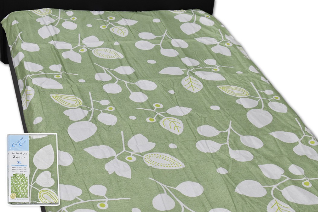 シングルSL ふとんカバーリング3点セット リーフ柄グリーン