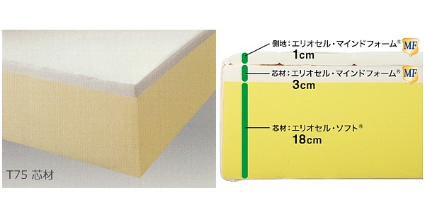 エリオセルの持つサポート力、優れた体圧分散性能はそのままに、よりソフトな特性を備えたエリオセルソフトを18cm厚で採用。さらに3cm厚のエリオセルMFを加えて、総厚23cmという贅沢な厚さが生み出すリッチな寝心地です。表裏で二通りの寝心地が楽しめます。