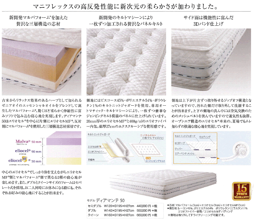 イタリアでダイヤモンドを意味するディアマンテ。ブランド誕生50周年に満を持して発表されたモデルディアマンテ50は、エリオセルを中心に「エリオセルMF」「エリオファイバー」「マルバフォーム」…と、マニフレックスの持てる素材開発力と技術力のすべてを結集して完成させた、まさしくダイヤの名にふさわしい珠玉のラグジュアリーモデルです。