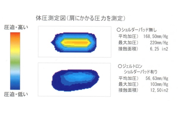 バッグから肩にかかる重さ、衝撃を軽減します。ジェルトロンショルダーパッドを使用することにより、肩との接触面積を約2倍に増やし、平均加圧を約1/3に減少します。さらに局部的な痛みの原因となる最大加圧も半減。さらに通気性も優れています。また、すべり止め効果もあり、肩からのずれ落ちを防ぎ、バッグの使用感をアップします。