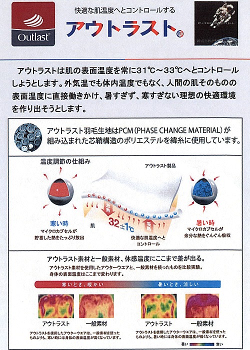 アウトラスト羽毛生地はPCM(PHASE CHANGE MATERIAL)が組込まれた芯鞘構造のポリエステルを緯糸に使用しています。暑いときはマイクロカプセルが余分な熱を吸収して肌の表面温度を下げ、寒いときは貯蓄した熱を放出して、快適な肌温度(32±1℃)へとコントロールしようとします。サイズL:50×70cm生地・素材側生地:綿60%・ポリエステル40%(アウトラスト)ホワイトダウン50%、スモールフェザー50%〔 720g 入〕カラー