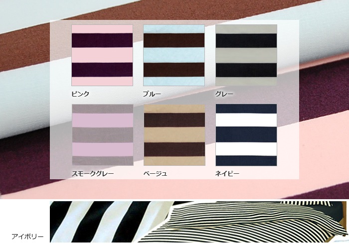 品質: 綿100% ( 平織、40番手、打込本数205 )ピンク… ピンク × パープル ブルー… ブルー × ブラウン アイボリー… アイボリー × ブラック グレー… グレー × ブラック スモークグレー… ピンク × スモークグレー ベージュ… ベージュ × ブラウン ネイビー… ホワイト × ネイビー Color name… Base color × Border