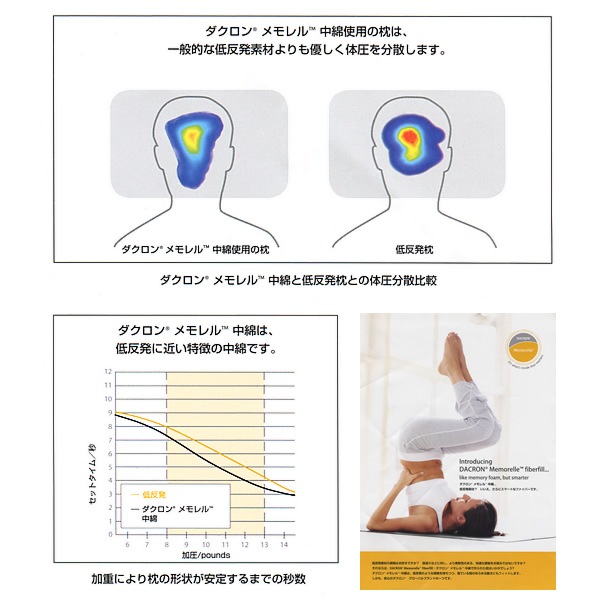 * ダクロン®メモレル®ファイバーフィルは低反発の感触でありながら、より柔軟があり快適であることが特徴です。消費者は低反発素材の感触を好むものの、その柔軟性のない硬さに問題を抱えることがあります。ダクロン®メモレル®は低反発の素材のフィット感に加え、首や頭の動きへの柔軟性と、頭圧体圧分散性を改善し、より快適な休息を提供します。
