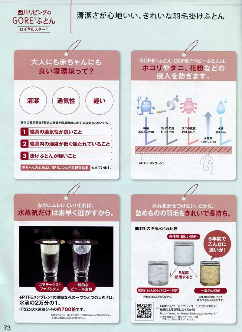 羽毛ふとんの側生地は、一般的に大量の糸で高密度に織りあげ、その隙間を埋めるダウンプルーフ加工を施さなければなりませんでした。そしてそれが羽毛の特質である吸湿、発散性を妨げることになっていました。羽毛本来の機能を最大限に活かす――ロイヤルスターは、西川リビングと日本ゴア株式会社との共同開発により生まれた画期的な側生地を備えた羽毛ふとんです。