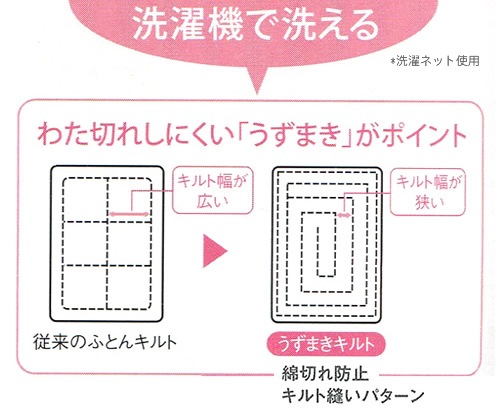 洗ってもわたの片寄り、わた切れしにくい!。
