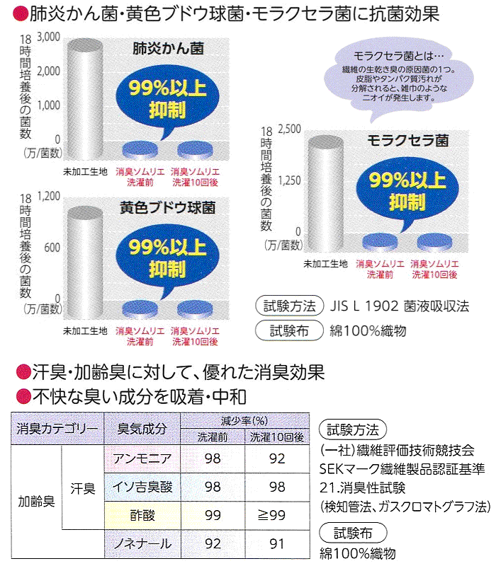 繊維に付いた臭いの原因菌や細菌(肺炎桿菌、黄色ブドウ球菌、モラクセラ)の増殖を99%以上抑制。