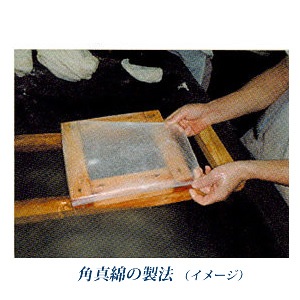 大釜で煮て洗いほぐした繭を引き伸ばし、木枠に重ねていきます。数個の繭で1枚の角真綿ができます。そのハンカチのような形状からハンカチ真綿とも呼ばれます。1枚の重量にバラツキがあるため、角真綿は重量表示されています。サイズ約26×26cm 約1kg入、日本製