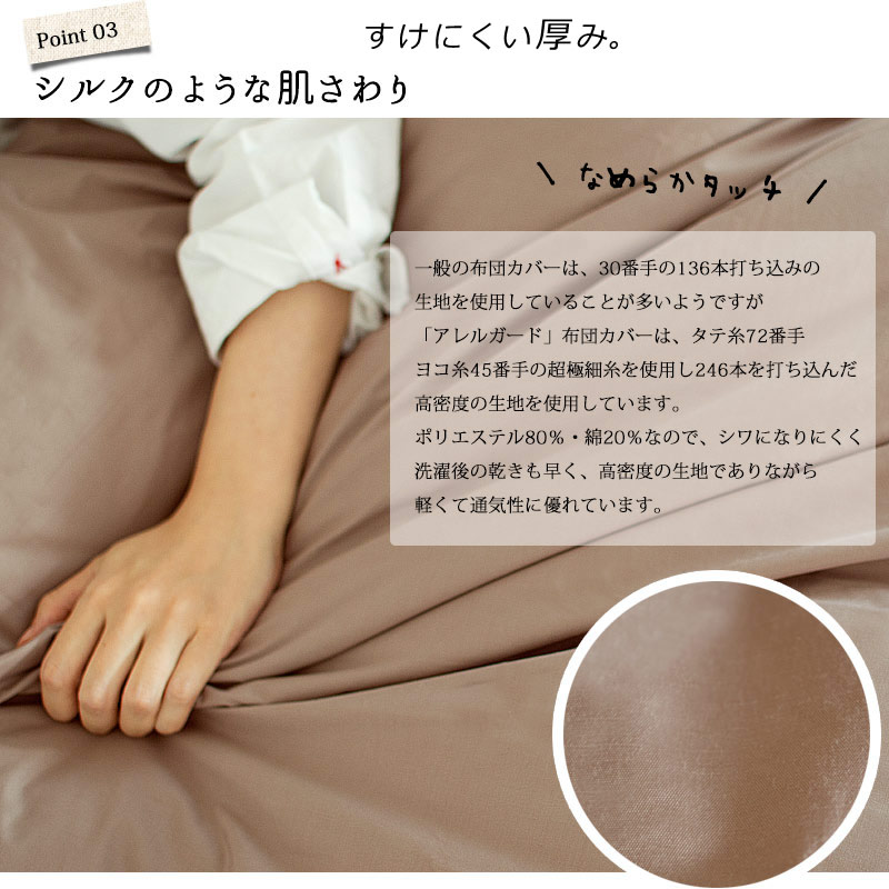 「アレルガード」布団カバーは、タテ糸72番手、ヨコ糸45番手の超極細糸を使用し、246本打ち込んだ高密度生地を使用しています。超極細繊維を使用していますので軽くてガサツキ感が少なくシルクのような肌さわり。