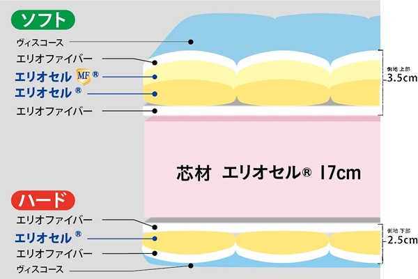 側地のパディング上面はしっとりとソフトな感触が特長のエリオセル・マインドフォーム1cm+エリオセル0.8cmをエリオファイバーでサンドした4層構造。また、下面の側地にはエリオセル0.8cmをエリオファイバーでサンドした3層構造です。心地よいフィット感としっかり弾力感。高反発フォームを贅沢に使い、理想的な寝姿勢をキープします。