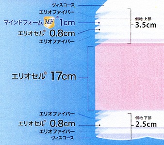 側地のパディング上面はしっとりとソフトな感触が特長のエリオセル・マインドフォーム1cm+エリオセル0.8cmをエリオファイバーでサンドした4層構造。また、下面の側地にはエリオセル0.8cmをエリオファイバーでサンドした3層構造です。心地よいフィット感としっかり弾力感。高反発フォームを贅沢に使い、理想的な寝姿勢をキープします。