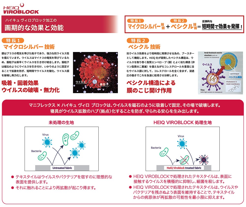 * ハイキュヴィロブロック加工は、独自の技術により、製品の繊維に付着したウィルスを短時間に減少させる効果が実証されています。この効果は寝室全体に及ぶものではありません。換気や手洗いなど、感染症対策として奨励される行為を実施した上で本製品をご使用いただくことをおすすめします。