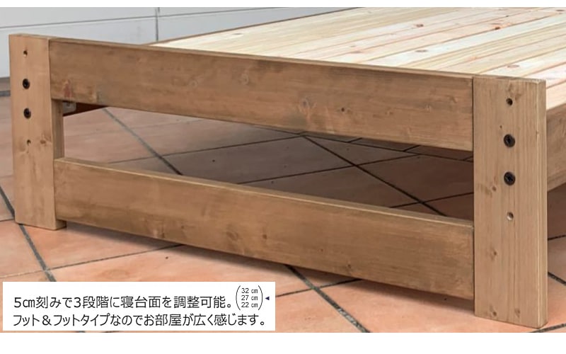 床面高さ3段階:32cm/27cm/22cm生地・素材フレーム材:ひのき無垢材(オイル塗装)床板すのこ:ひのきラス板(ラッカー塗装)カラー1 ウォルナット色