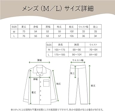 ・トップスの袖口と、ボトムの裾にはゴム通し孔があります。袖や裾が長い場合にゴム袖にアレンジ可能です。サイズM:身長160-175cm、胸囲88-96cm、ウエスト76-84cm