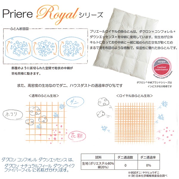 〈Royal(ロイヤル)〉シリーズは掛けふとんをワンランク上にしたシリーズです。ダクロン®コンフォレル®ダウンエッセンスを中綿に使用しています。側生地が立体キルトになっており中綿といっしょに暖められた空気が動くためまるで羽毛布団のような感触で、保温性に優れた掛ふとんです。また、ご家庭の洗濯機で丸洗いできます。