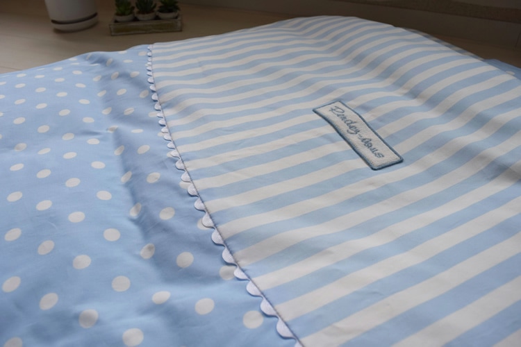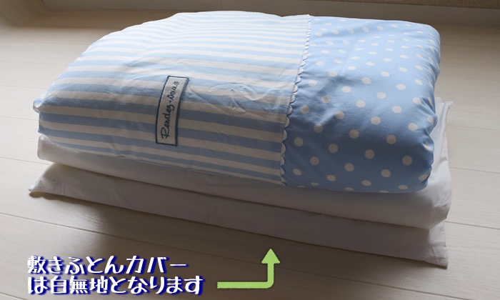 - お昼寝の掛ふとん・敷ふとん・掛敷カバーのセット。専用バッグ付き5点セット。