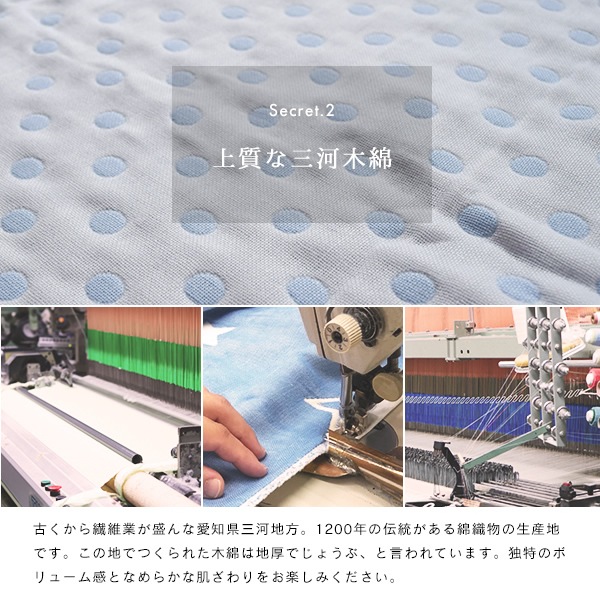 愛知県蒲郡で熟練の職人が丁寧に作り上げる三河木綿を使用した、ふんわりやわらかな6重ガーゼケット。織りから仕上げまで日本国内にこだわり、漂白剤や蛍光増白剤などの化学薬品を一切使っていない安心安全な品質です。乾きも早く軽いガーゼ素材は、気兼ねなく洗濯もでき清潔に保ちやすく、洗うたびにやわらかさが増して、使い込むことで肌に馴染みます。