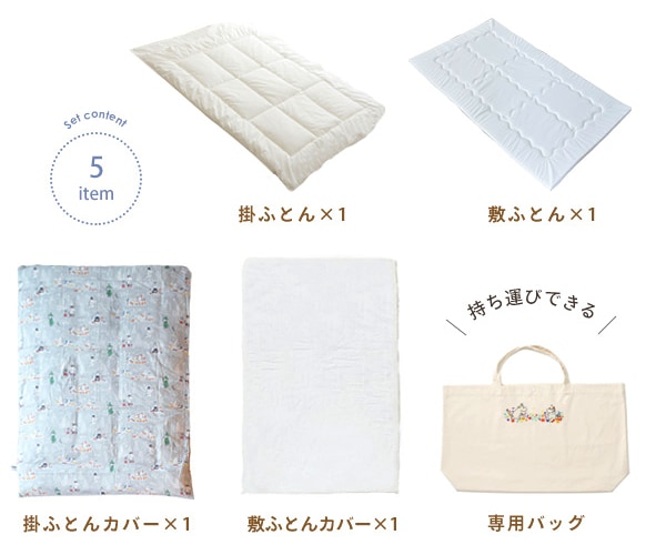お昼寝の掛ふとん・敷ふとん・掛敷カバーのセット。専用バッグ付き5点セット。