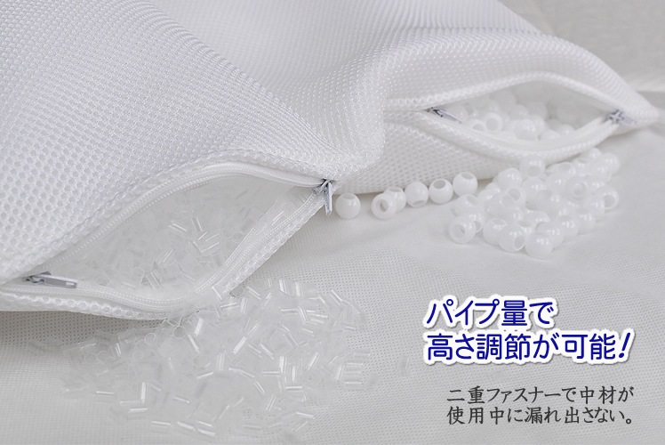 枕の側面にファスナーがあり、中にあるパイプの量を調節できるため、自分に合った最適な高さにして使用できます。