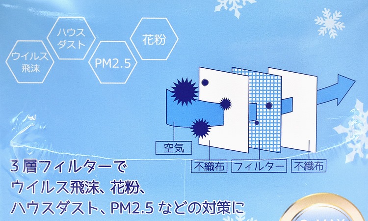高性能フィルタ入り3層構造で、花粉やホコリ、PM2.5、ウィルス飛沫等の侵入をブロックします。 ※マスクは感染(侵入)を完全に防ぐものではありません。