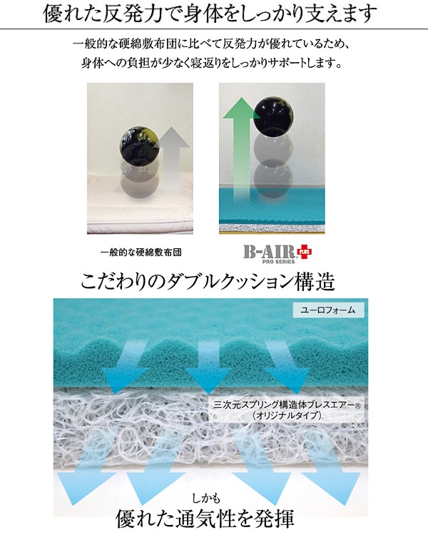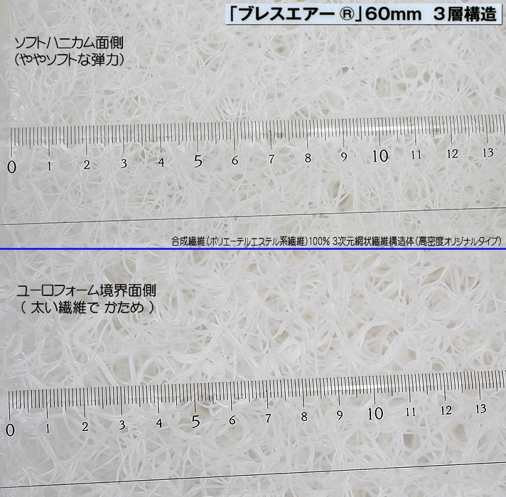 厳選されたヨーロッパ大手ユーロフォーム社製の高弾発性ウレタンフォーム(ユーロフォーム)と国内大手東洋紡の三次元スプリング構造体ブレスエアー(高密度オリジナル)を使用し、眠りにこだわる匠(工場職人)たちが厳しい目でチェックし手作業で製品を仕上げています。また、デザインや側生地にもこだわり、一年通して快適にご使用いただける寝具になりました。