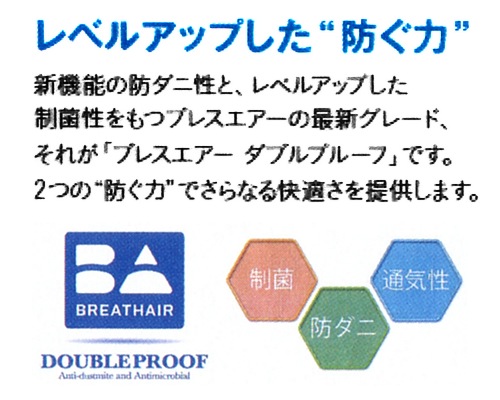 新機能の防ダニ性と、レベルアップした制菌性をもつブレスエアーの最新グレード、それが「ブレスエアー ダブルプルーフ」です。2つの防ぐチカラでさらなる快適さを提供します。通気性にすぐれ、夏は蒸れにくく冬は快適な温度です。