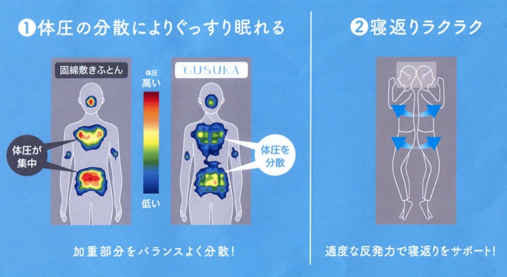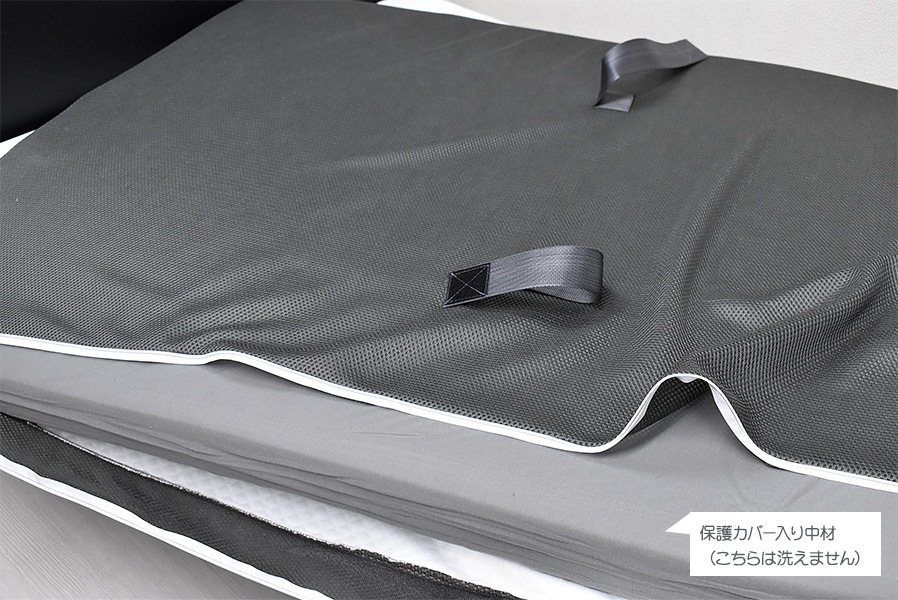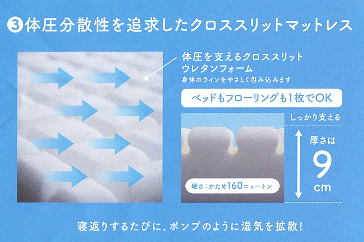 体圧を支える中材のウレタンフォームに特殊形状の凹凸構造を施してあります。身体のラインをやさしく包み込み、寝返りするたびにポンプのように湿気を拡散します。
