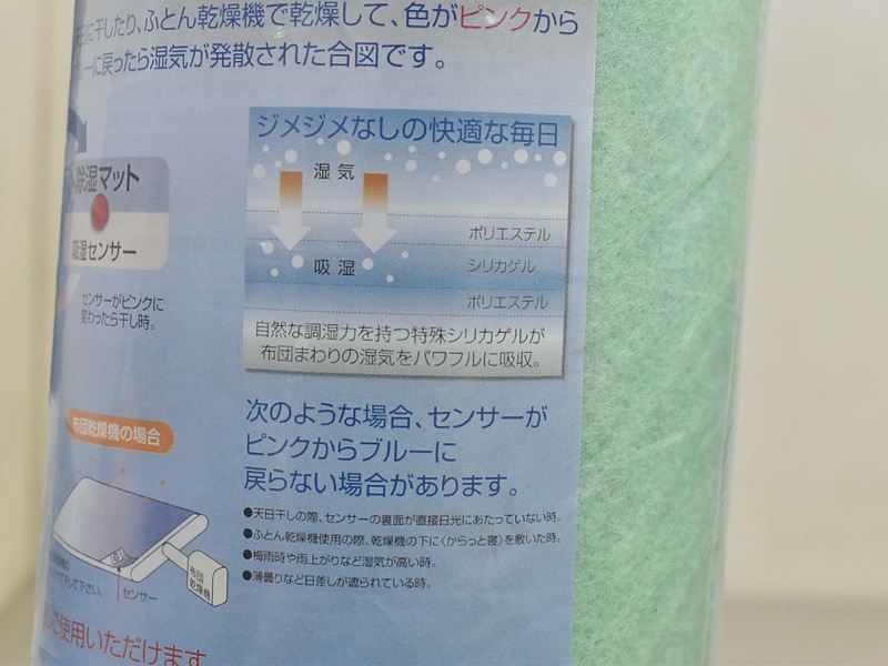 天日干しまたは布団乾燥機で乾燥することで、繰り返しご使用いただけます。 「調湿センサー」がピンク●になったら、ブルー●に戻るまで干してください。