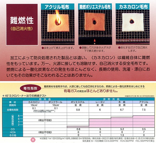 加工によって防炎処理された製品とは違い、カネカロンは繊維自体に難燃性をもっています。万一、火源に接しても溶融しにくく、火源を遠ざければ燃え広がることはなく、炭化することによってすみやかに自己消化します。また、加工ではないため洗濯や長期の使用によって、難燃性能が損なわれることがありません。