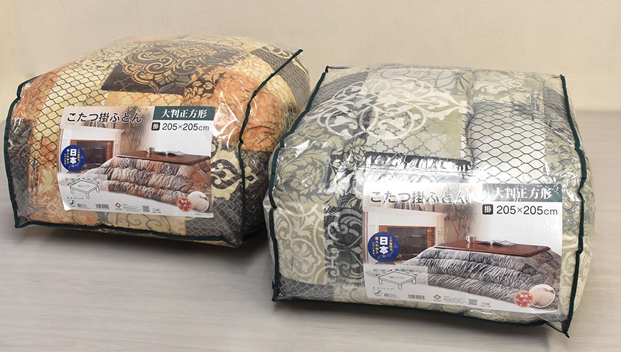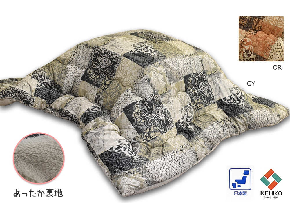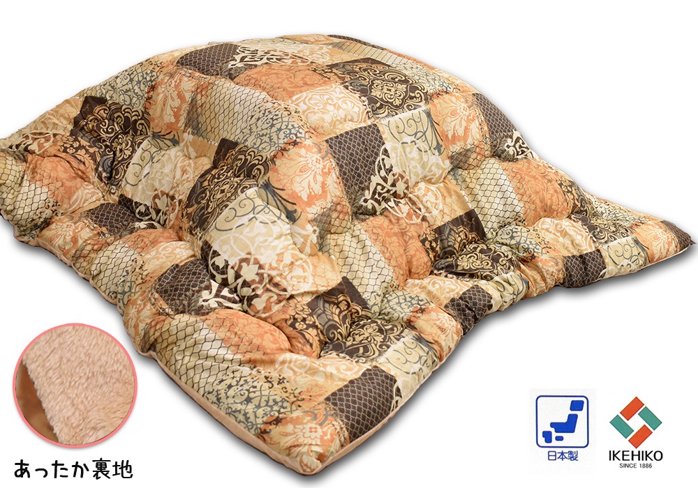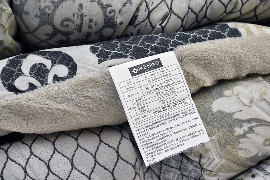 適合こたつ天板サイズ: 正方形80cm~90cm巾サイズ側サイズ220×220cm、製品サイズ約205×205cm、日本製生地・素材表側地:ポリエステル100%プリント、裏側地:ポリエステル100%ボア中わた:ポリエステル100%、2.2kg入カラー2