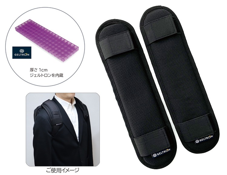 宇宙船内用衝撃緩衝材の研究開発から生まれた単純立体構造ジェルを、二層一体成型の 立体格子型グミ状ジェルに進化させたのがジェルトロンです。素材はミネラルオイルとポリマー(米国FDA認可)からできており、グミキャンディーのような感触で体圧分散性、通気性、耐久性、衛生特性に優れています。─ 近年、ビジネスリュックを通勤に使用されるサラリーマンの方々が増えております。働き方の変化にともない、仕事で使用するノートPCや資料等で荷物の量が増え、それにより体への負担も増えています。 『ジェルトロン リュック用ショルダーパッド』は体圧分散性、振動吸収性、通気性に優れ、リュックのベルト部分に装着することで体への負荷を軽減させます。