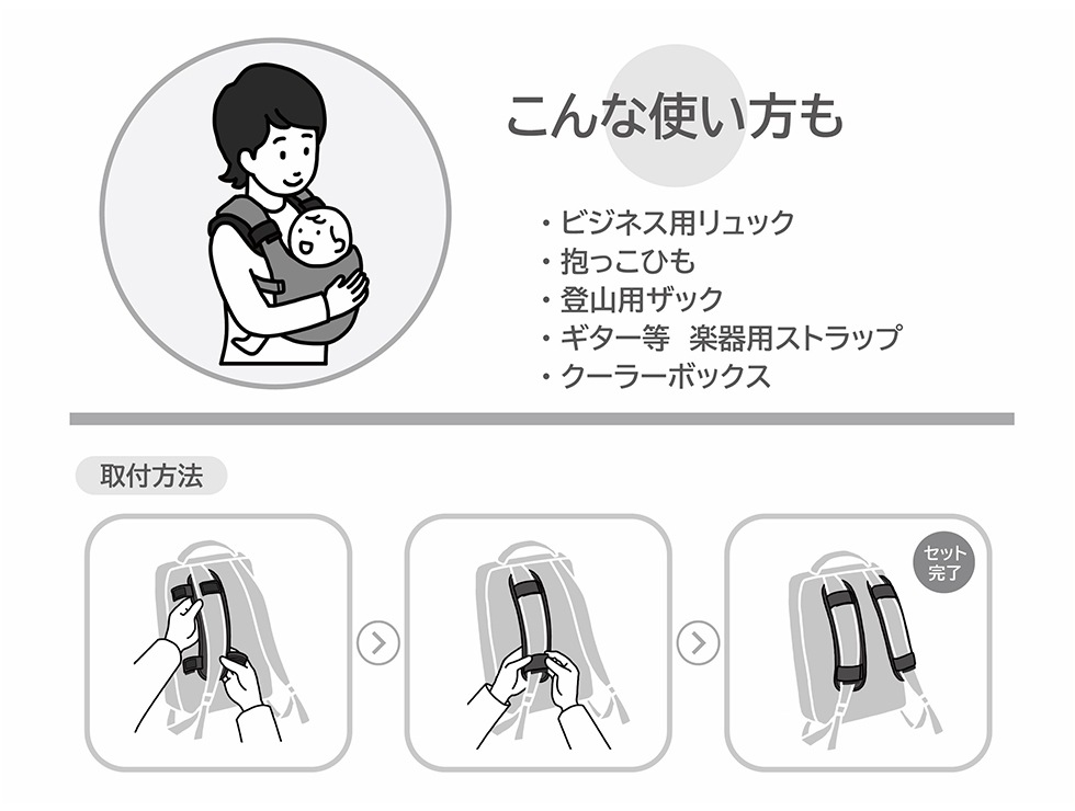 リュックから肩にかかる重さ、衝撃を軽減します。 バッグの重さや蒸れが軽減されるリュック用のショルダーパッド。 通勤・通学・アウトドア用などの重いリュックに最適です。また、赤ちゃんの抱っこ紐などにもお勧めです。(対応ベルト幅:7cmまで)