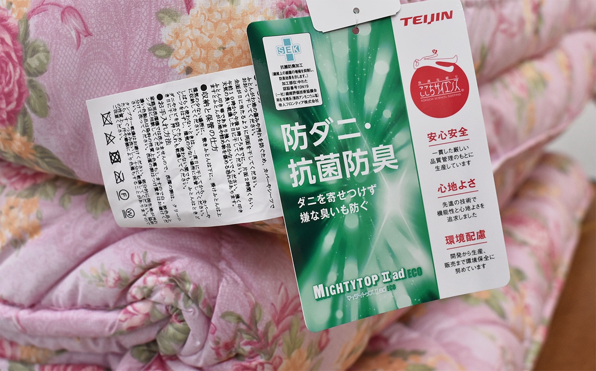 中わたの テイジン・マイティトップ®II ad ECOは、ふとんにつくダニを寄せつけず、いやな臭いも防ぐ。