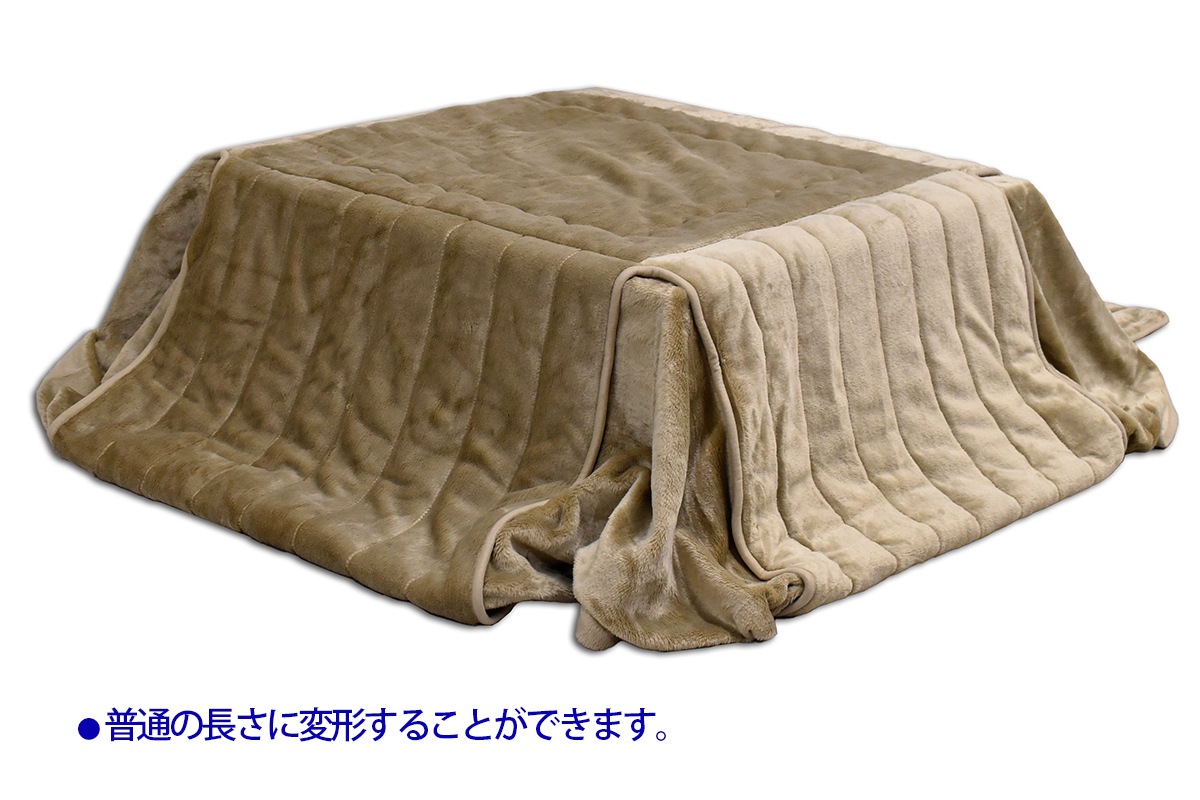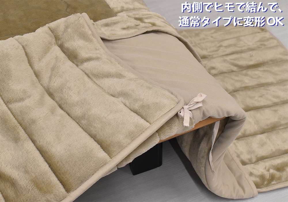 また、内側に折り返してヒモで留めることで、写真のように普通の長さのこたつ布団として使っていただけます。