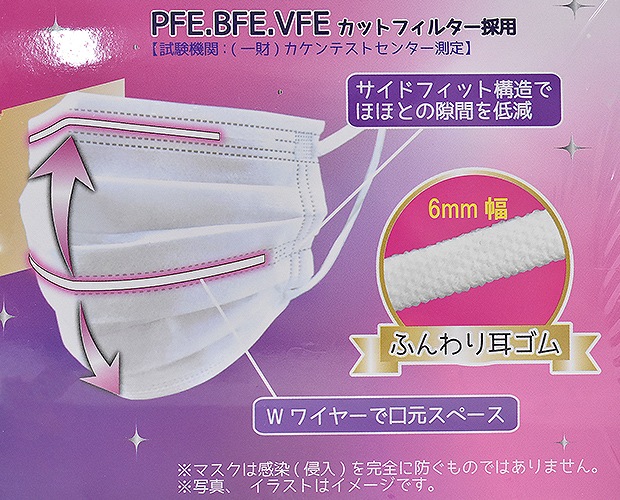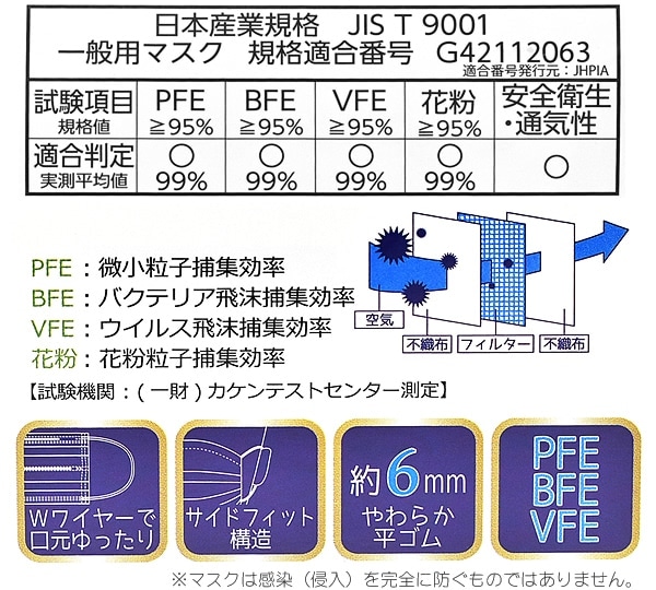 BFE試験済、VFE試験済、PFE試験済、花粉試験済、安全衛生・通気性試験済。 不織布 3層構造。