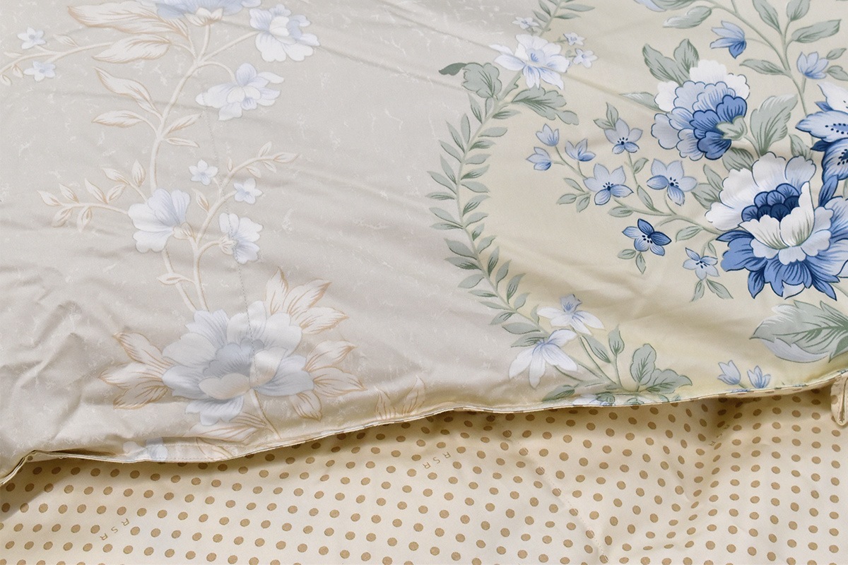 中心に中布を1枚入れて、上部と下部の2層構造で、体全体を優しく包んで保温し、体温を逃がしません。上部と下部のキルトをずらし、羽毛を均等の分配することにより、保温性・フィット性を高めました。