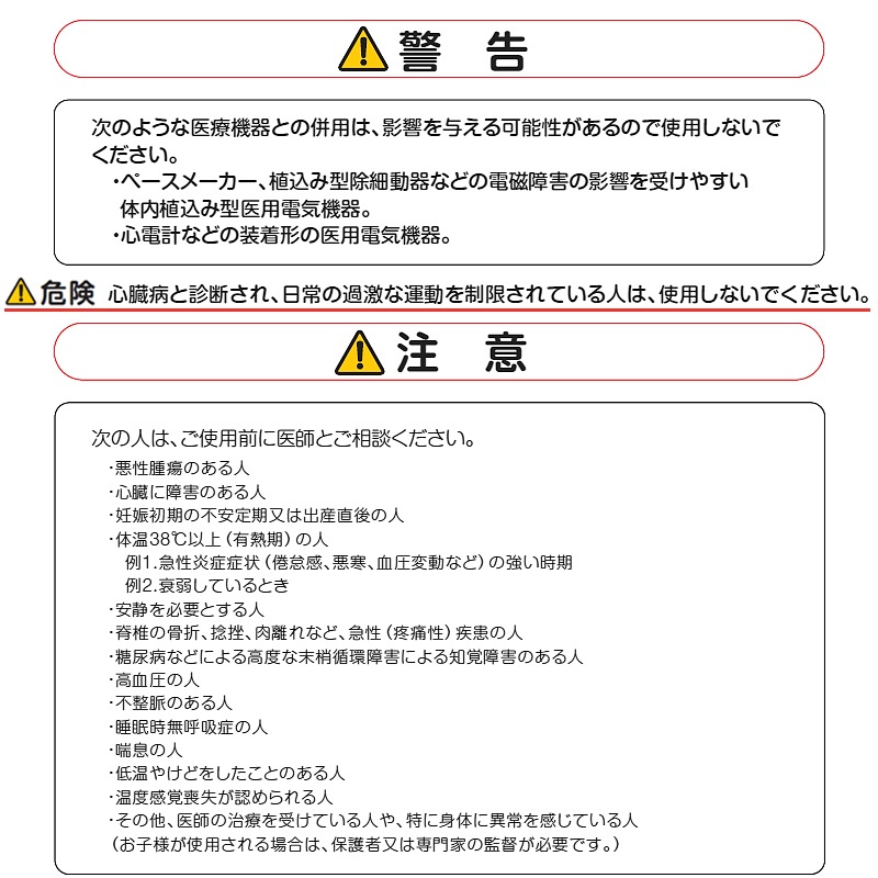 悪性腫瘍のある方、心臓に障害のある方、妊娠初期の不安定期又は出産直後の方、体温38℃以上(有熱期)の方、急性炎症症状(倦怠感・悪寒・血圧変動など)の強い時期にある方、衰弱している方、安静を必要とする方、脊椎の骨折・ねん挫・肉離れなど急性(疼痛性)疾患の方、糖尿病などによる高度な末梢循環障害による知覚障害のある方、高血圧の方、不整脈のある方、睡眠時無呼吸症の方、喘息の方、低温やけどをしたことのある方、温度感覚喪失が認められる方、その他 医師の治療を受けている方や、特に身体に異常を感じている方、お子様が使用される場合は保護者の監督が必要です。