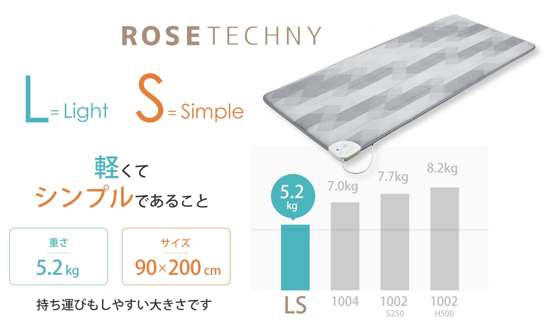 1984年に誕生した「ローズテクニー」は、幾度となく改良が施され、発売から40周年を迎えた今でも健康を支える寝具として、高い評価を得ています。サイズ90×200×3.5cm、5.2kg、100V (50/60Hz) 定格消費電力:温熱90W、電位1.5W(温熱+電位 90.5W)、日本製生地・素材側生地:ポリエステル100%詰めもの:特殊カーボン面発熱体(電床)、ポリエステル固わたカラーグレー-