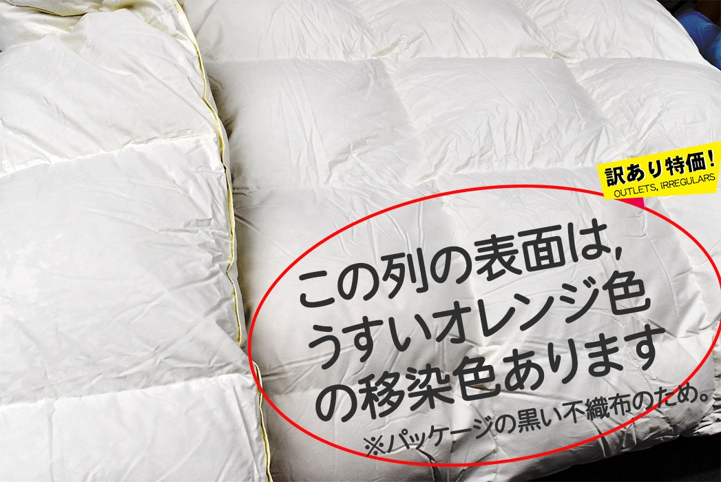 白い側生地の表面一部にうすいオレンジ色のシミとなって着色が見られます。写真には出にくい色濃度です。黒いパッケージ不織布の色素が移染したものと思われます。(市販カバーを掛けるなど通常の寝具としてのご使用には問題ありません。)