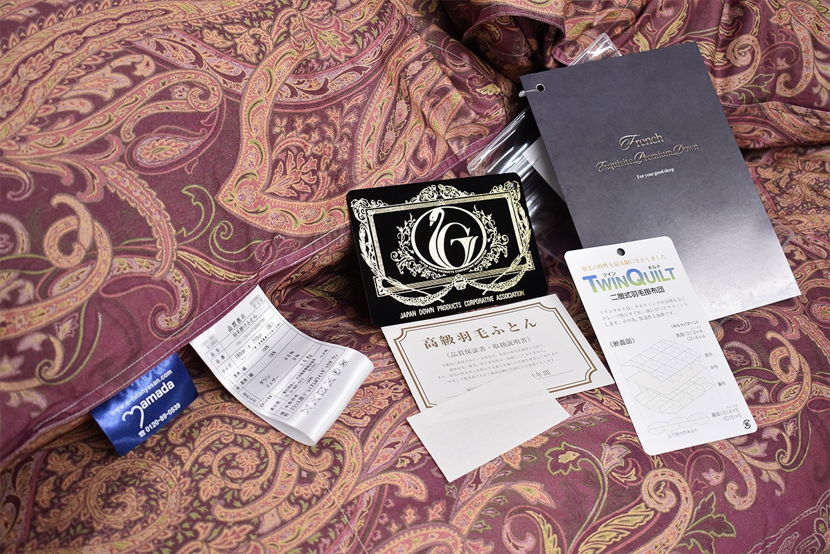 このプレミアムゴールドラベルの付いている羽毛ふとんは、日本羽毛製品協同組合の品質基準に合格したものです。