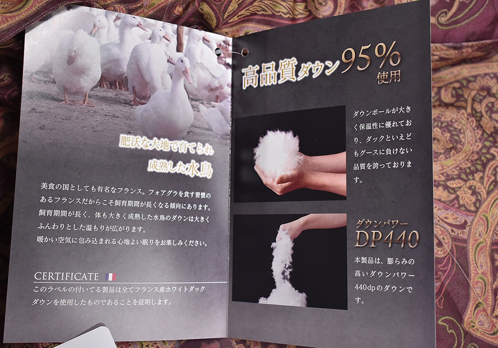 高品質ダウン95%使用。ダウンボールが大きく保温性に優れており、ダックといえどもグースに負けない品質を誇っています。極上の眠りを フランスから あなたへ。