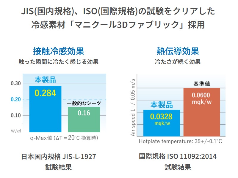 国内規格JIS L1927 に基づく接触冷感試験、さらに国際規格ISO11092 の熱伝導性の試験を行い、その機能性の高さが証明されています。