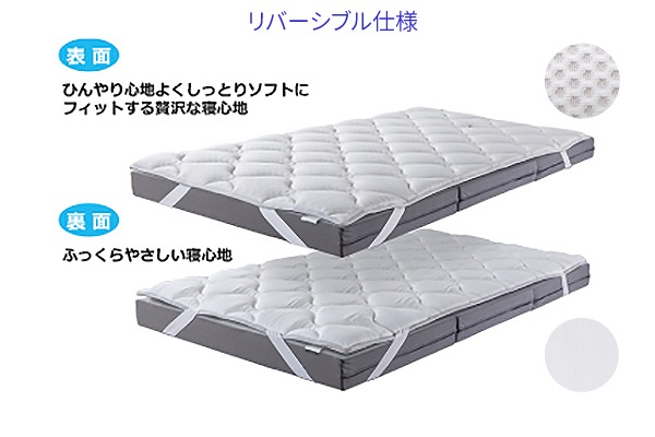 また、裏面はふっくらやさしい寝心地で吸水性にすぐれたマイクロファイバー生地を採用。両面使えるリバーシブル仕様で一年を通じて快適にお休みいただけます。