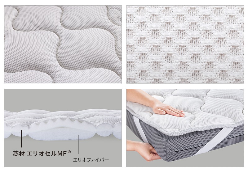 表側地に採用した凹凸のあるハニカム構造の「マニクール 3Dファブリック」は、通気性も抜群です。冷感効果や通気性、そして肌離れが良い「マニクール3D ファブリック」に、キルティング加工施すことで、身体の接地面をさらに減らし、寝返りの際の肌離れをよりスムーズにします。