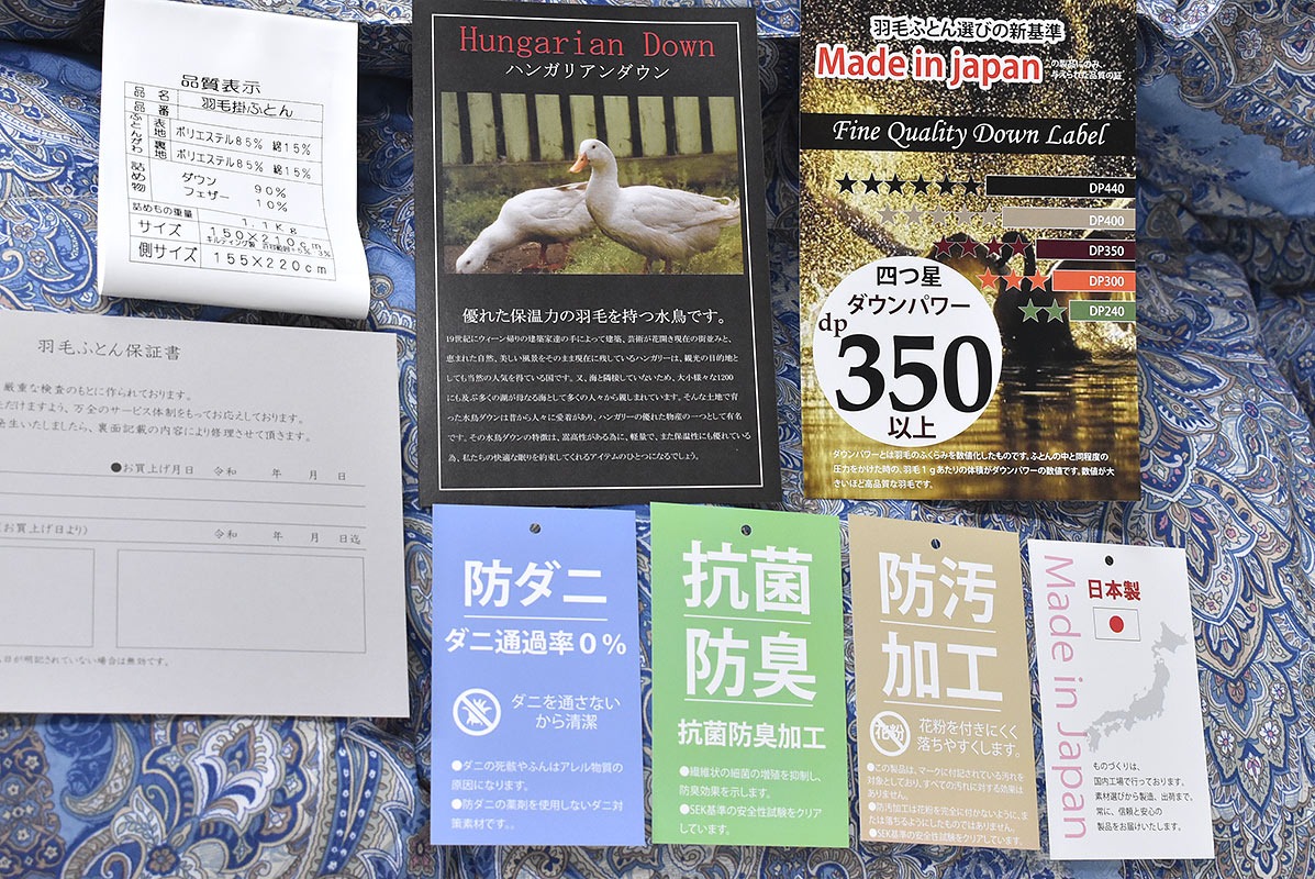 ・SEK基準の安全性試験をクリアしています。サイズ(SL) 150×210cm、日本製生地・素材生地:ポリエステル85%・綿15%、防ダニ(通過率0%)、抗菌防臭加工、防汚加工(花粉)ハンガリアンダウン90%、350dp、1.1kg入カラー1