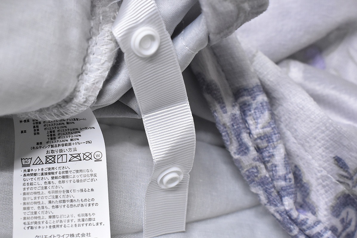 * 長時間 壁に直接接触する状態でご使用にならないでください。壁紙の種類によっては化学反応を起こし、色落ち色移りする場合がございますのでご注意ください。サイズSL:150×210cm、Made in China生地・素材(衿・表面)表側ポリエステル100%マイクロファイバー、中間ポリエステル100%アルミ蒸着シート、裏側ポリエステル80%・綿20%、(裏面)表側ポリエステル100%フランネル、詰めもの{上層ポリエステル80%・レーヨン20%/中層ポリエステル100%/下層ポリエステル100%}、裏側ポリエステル80%・綿20%全開ファスナー、8ヶ所スナップ付ひもカラー2