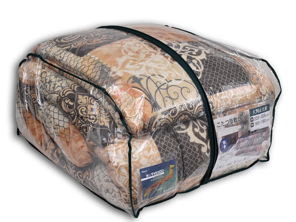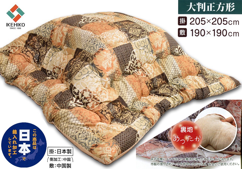 適合こたつ天板サイズ: 正方形80cm~90cm巾※新品在庫品です。パッケージダメージあり。サイズ(掛)側サイズ220×220cm、製品サイズ約205×205cm、側加工 中国、製品加工 日本
