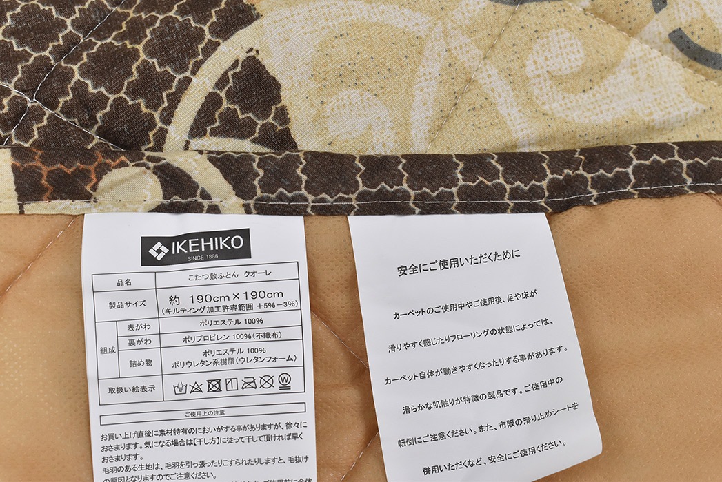 (敷き)表側 ポリエステル100%プリント/裏側 ポリプロピレン100%不織布(掛け)詰めもの:ポリエステル100%、2.2kg入
