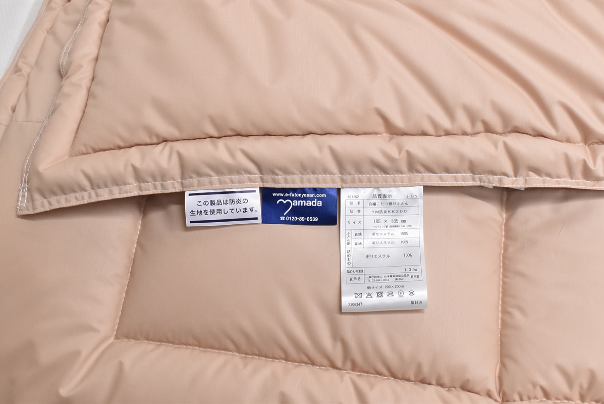 日本製生地・素材側地:ポリエステル100%(テイジン難燃ポリエステル)中綿:防炎エクスタ(ポリエステル100%)、1.3kgカラーサンドベージュ