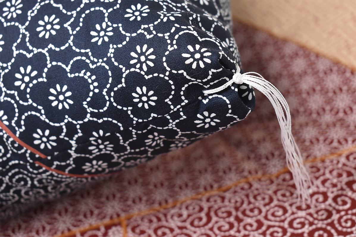 さらっとしたタッチの平織生地で、中央と四隅に白房付き。