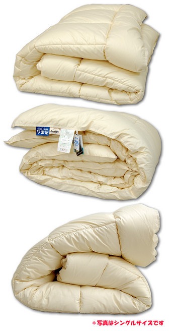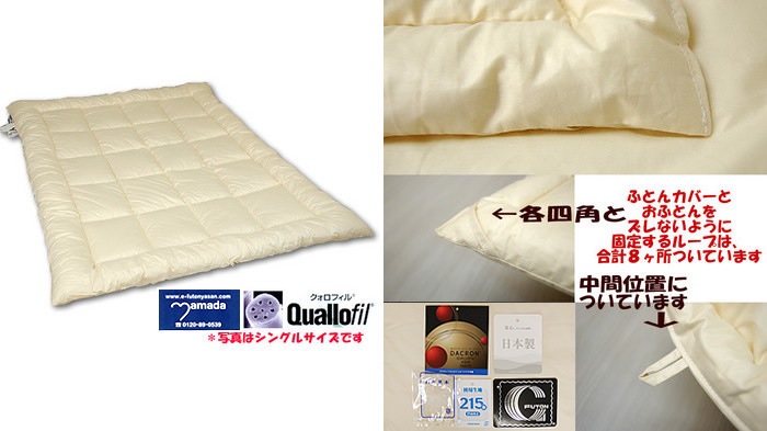 ふとんにカバーをかけてお届けいたします。お気軽にお申し付けくださいサイズキングロング:230×210cm・3.0kg、日本製生地・素材綿100%(205本以上打込み)、ループ(受けひも)8ヶ所付きダクロン「クォロフィル」アクア中綿(ポリエステル100%)カラーアイボリー
